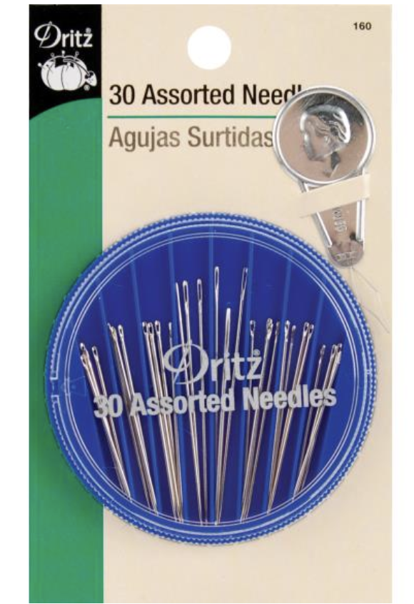 DRITZ-30 assorted needles in a compact plus a threader. Includes betweens size 7, sharps size 7, sharps size 5, tapestry/embroidery size 20/6, and embroidery size 7.