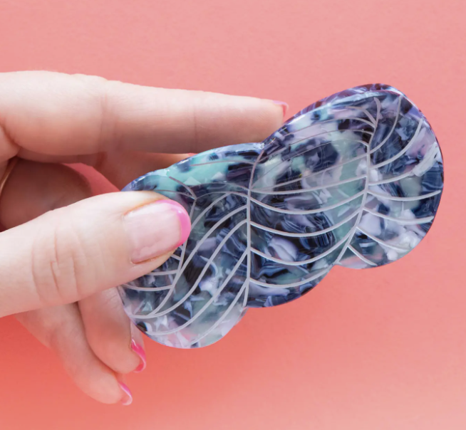Perfect for knitters and crocheters, the Blue Yarn Hair Claw Clip is made from eco-friendly cellulose acetate. Its tortoise shell design shines with iridescent blues and grays, accented by embossed lines that add texture and charm. This playful clip keeps hair neatly in place while showing off your love for yarn crafts. And like all our hair accessories, it's made from plant-based cellulose acetate, meaning it's biodegradable and better for the environment.