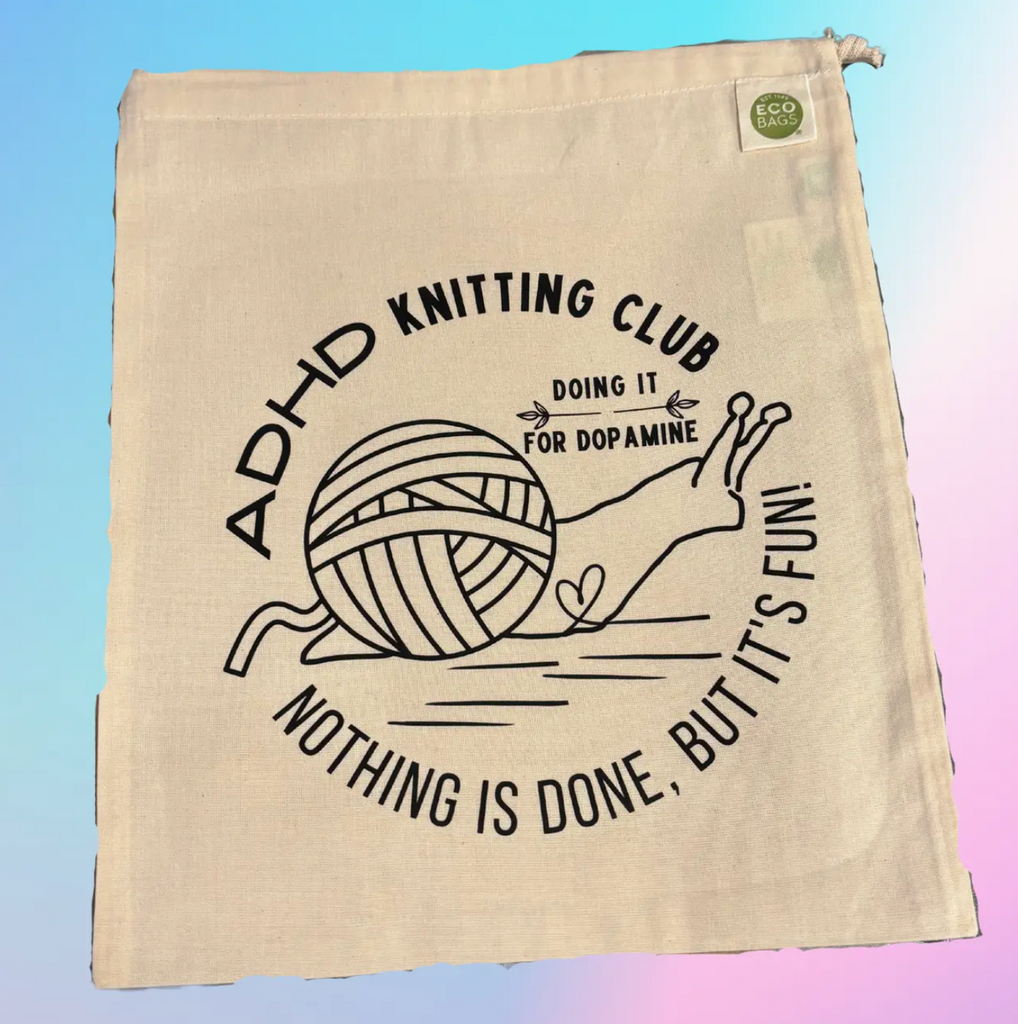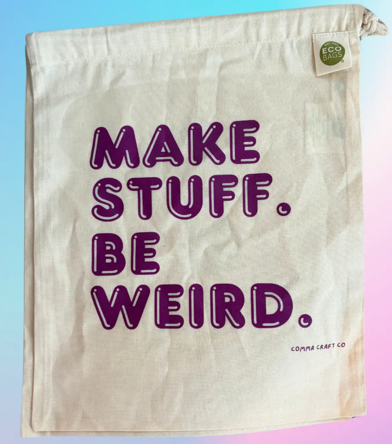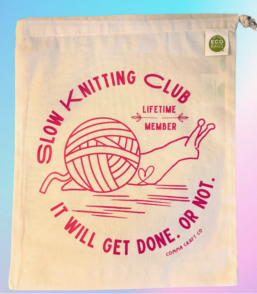 Drawstring Project Bag Small Medium Size Knitting Crochet Weaving Spinning WIP Gifts for Knitters These 12" x 10" project bags are your go-to on-the-go size! Can easily fit a sock, small shawl, drop spindle, bookmark loom, whatever project--and folds down very small when not in use. Win-win! These are the GOAT of project bags from the brand ECOBAGS. 100% Organic Cotton The artwork has been added by hand (my hand! in my studio!) to the bag via professional-quality DTF printing and a heatpress. (These premium inks and adhesive are made to last 100 trips thorough the washing machine so no need to worry about your artwork on these!)