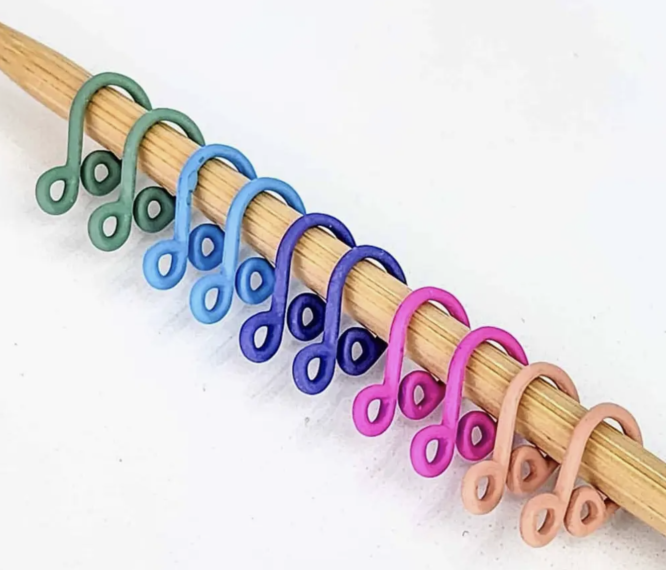The perfect 1 handed clip marker! Pop it on, pop it off, no need to open and close a safety pin again. Cast metal stitch markers are thick and substantial on your needles. Formed with closed loop ends for a completely snag free finish! Set of 10 stitch markers, 2 markers in each color - blue, green, peach, pink, & purple