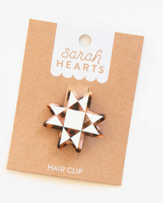 Elevate your hair game with our Quilt Star Hair Clip, inspired by the timeless sawtooth star quilt block. Featuring a chic blend of brown and blush pink tortoise shell with a cream screen-printed design, this petite barrette brings a modern twist to a classic motif. Crafted from plant-based acetate and secured with a gold alligator clip, it’s as stylish as it is sustainable. Whether you’re heading to a quilt guild meeting or just love a handmade touch, this clip is the perfect accessory for any sewist or maker on the go. Details: Made from eco-friendly plant-based acetate Brown & blush pink tortoise shell with cream print Gold alligator clip for secure hold