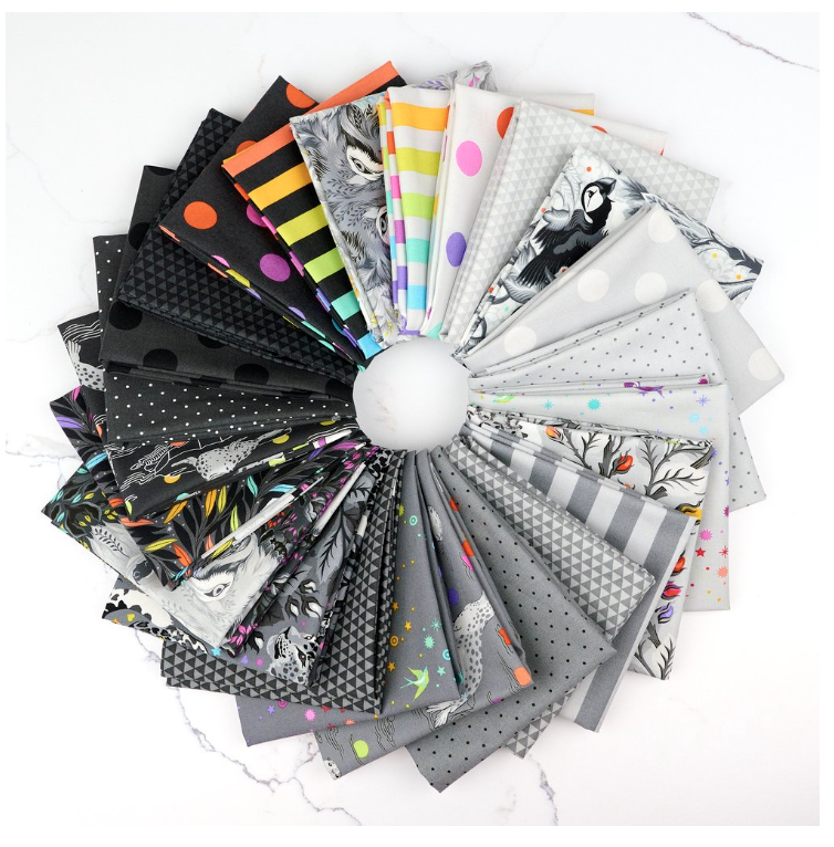 Graywork is a follow up to my black and white collection titled “Linework” from 2020. This is a neutral collection designed in various shades of gray to fill the spaces between the rainbows. Graywork began as a collection of all gray prints and slowly blossomed to include touches of color to spice things up. I find it impossible to leave something completely void of color. For the main prints of the collection I focused on animals that live their lives in shades of gray; Wolves, Bears, Snow Leopards, Puffins and Sea Lions. These eight prints are big and illustrative packed with details deigned for fussy cutting as the stars of the show. The coordinating prints are variations on existing True Colors prints with some new pieces for texture. These might be the back up dancers to the hero prints but they are essential to connecting the prints and filling in the gradient or grays. The multi colored Stripe is back on both a soft gray and a charcoal gray ground and the Poms have been added to the party in a new rainbow version to coordinate with the stripes! You will find new medium and dark shades of Fairy Dust sprinkled in amongst the classic tonal grays for backgrounds and blending. The last thing that I felt this collection really needed was something that could act like a solid which came in the form of new Tiny Dots and a brand new print of tonal repeating triangles called “Kinda Shady”. While packed with artistic details this collection is designed, first and foremost to be useful. Leave it be or add in my other collections for maximum versatility.